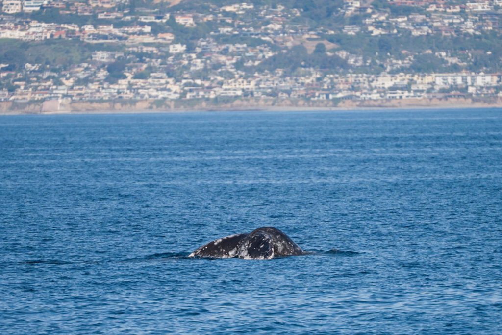 Our first gray today was definitely vessel‑avoidant, so we chose to leave it be and let it continue its southbound migration. Luckily, another gray was less than a mile away. This whale stayed at the surface, continued south, and came up to breathe completely unphased by us — so we spent some time with this one until we ran out of daylight and had to head back to shore.