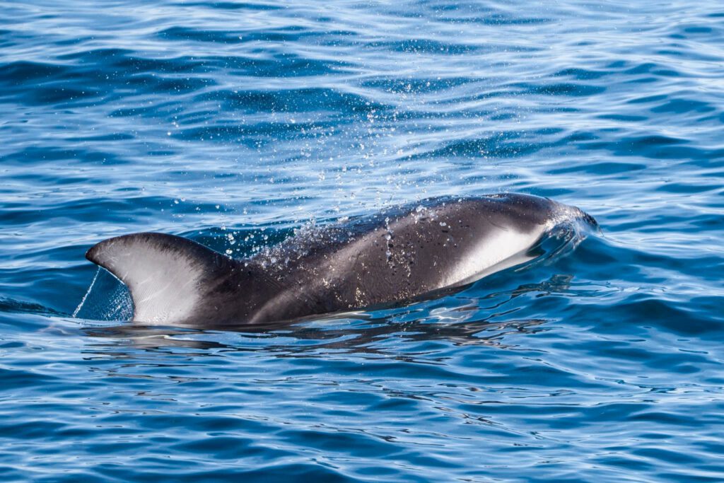 While we were spending time with the white‑sides, spouts started popping up on the horizon. Now, you might think whale watching is easy — you go out, find a whale, and watch it. But these animals are highly intelligent, with needs, wants, and personalities of their own. Some whales don’t bat an eye at a large vessel, while others are incredibly avoidant.