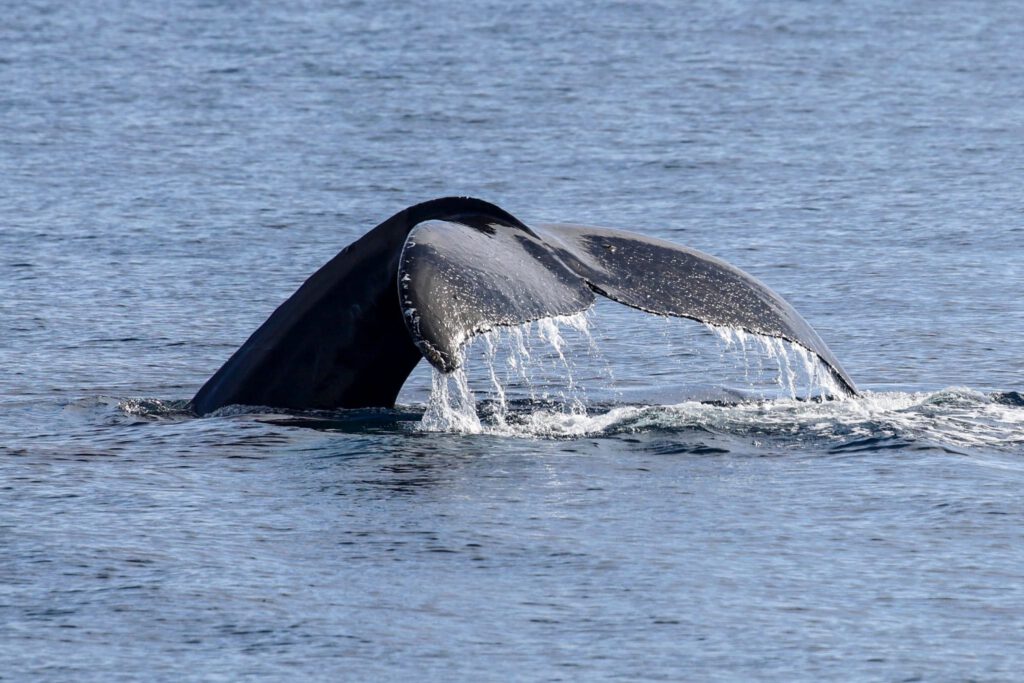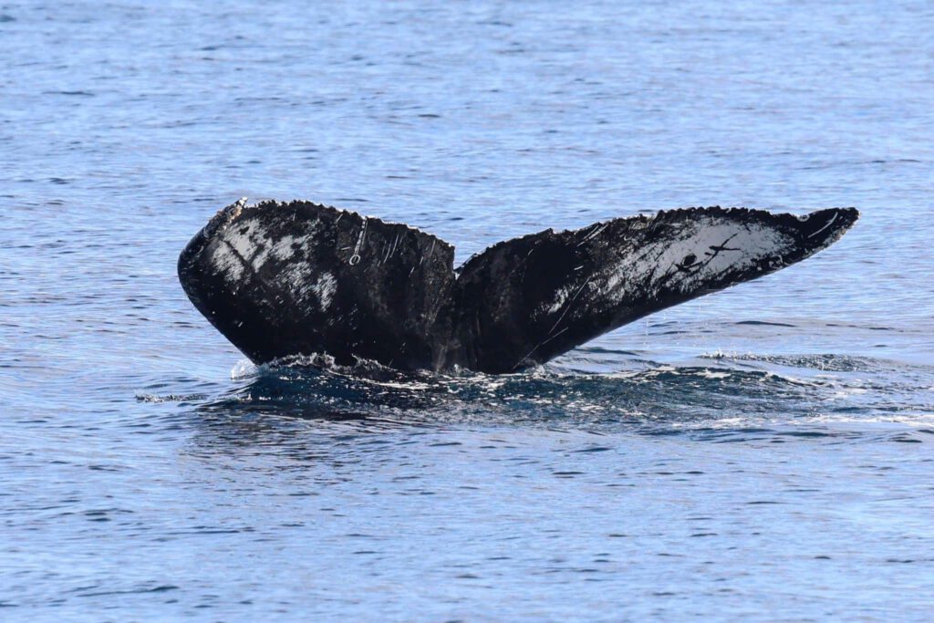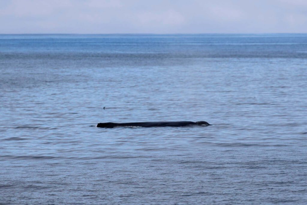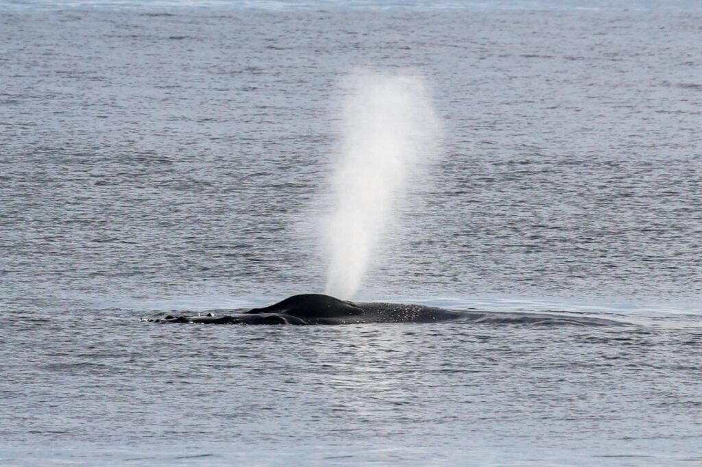 It was a humpback whale resting with its back and dorsal fin just above the surface. Minimal movements and minimal spouts at first just planking, it was peculiar. Then a very large spout from a very large humpback shot up right next to it.