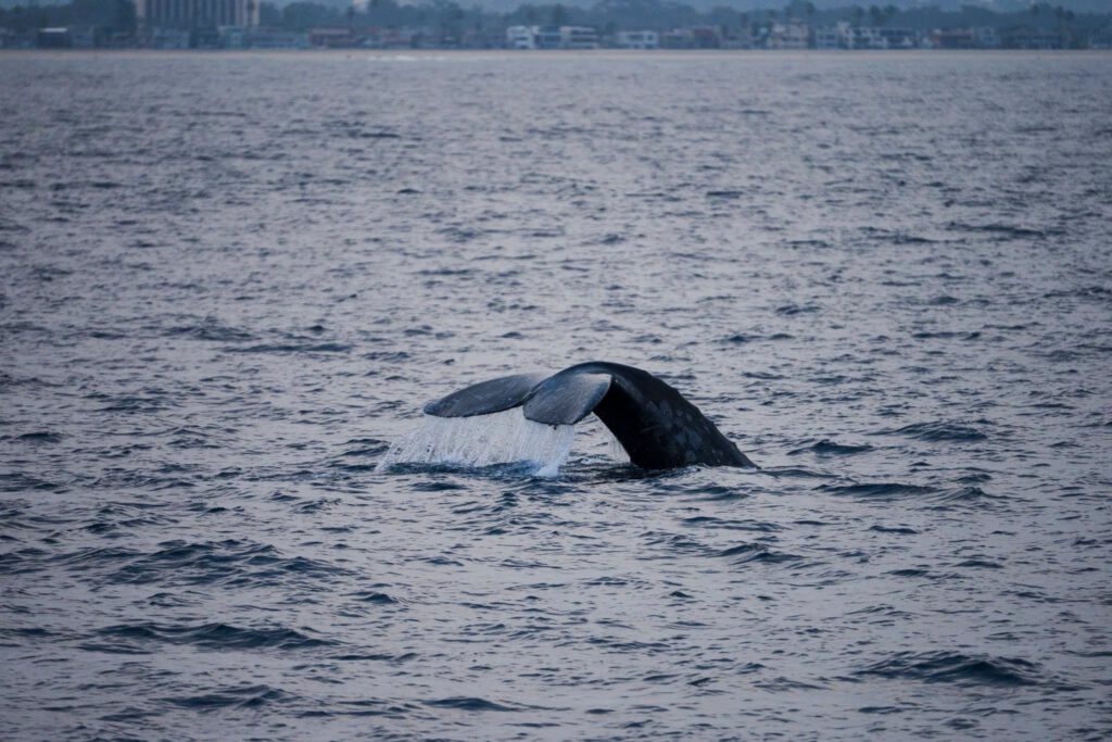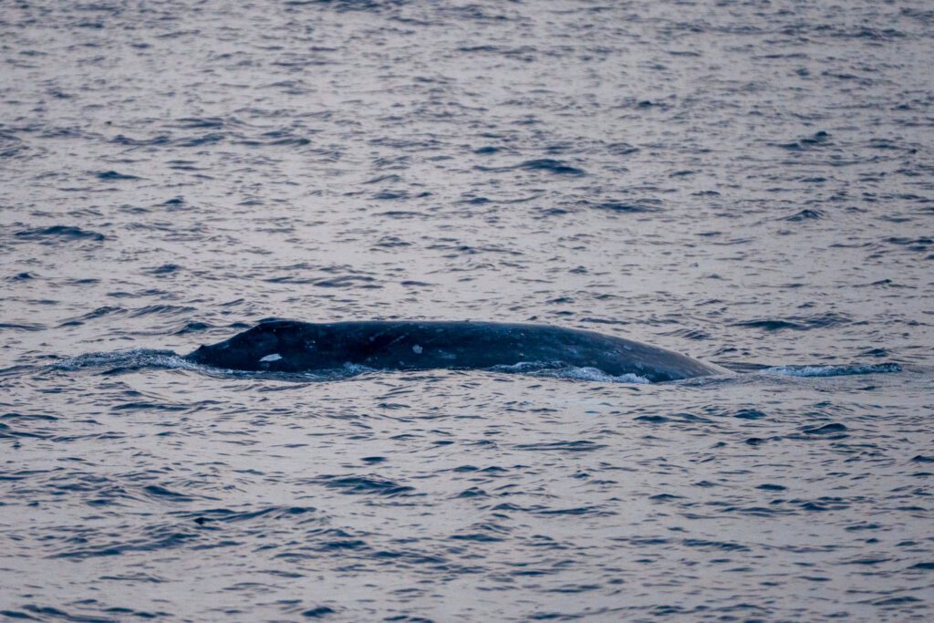 When we find these whales so close to their breeding grounds, it’s not unusual to see mating behaviors. And when it comes to whales, it takes three to tango — two whales floating in love and one whale acting as the support crew. We watched two leading whales and three others rolling around together, flashing pectoral flippers and showing off some flukes.