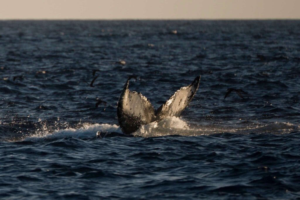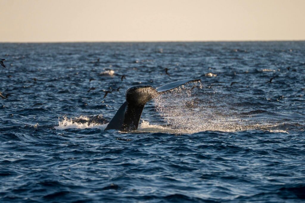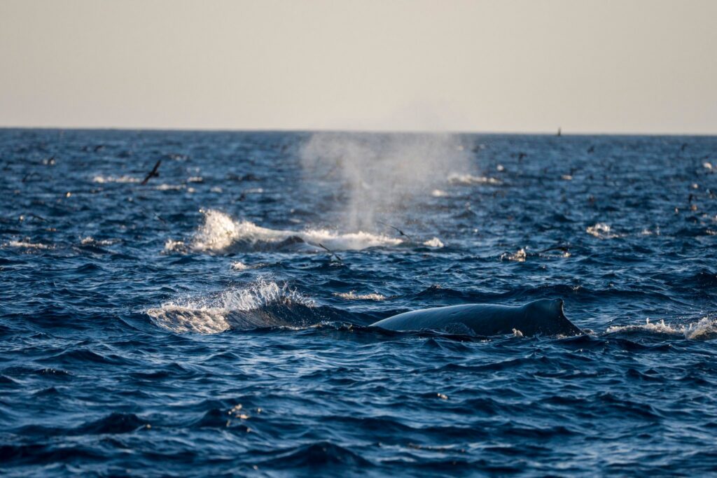 We got a call that pulled us off our original course — and thank goodness we listened. Far offshore we found a frenzy of 300 common dolphins and THREE MASSIVE feeding humpback whales! One whale came within 20 feet of the vessel, right at the bow — the whole boat erupted in shrieks of joy. Pure magic.