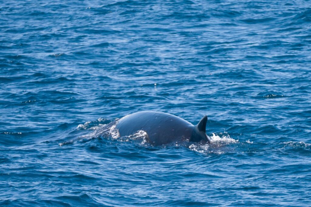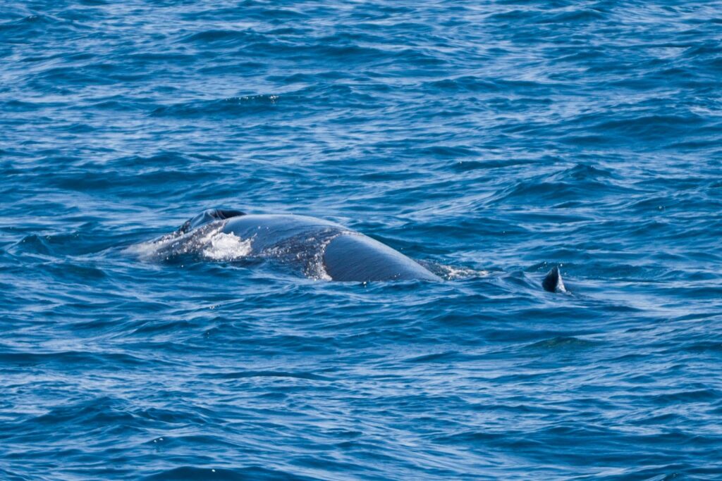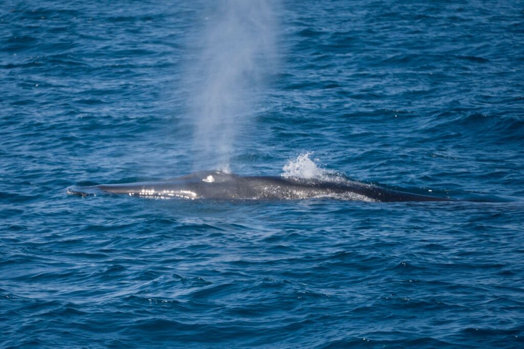 There were two fin whales in the area, but one of them was VERY boat‑curious—surfacing RIGHT IN FRONT OF OUR VESSEL, diving briefly, then coming up RIGHT NEXT TO US again and again! This whale seemed just as curious about us as we were about it.