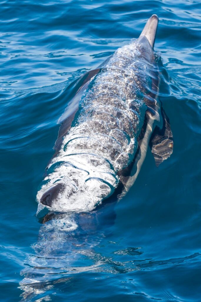 We ran two trips today, and both had two fin whales and long‑beaked common dolphins. We got great looks on both trips, but the sunset trip was the benchmark. We set out searching, found awesome dolphins everywhere, and saved the best for last!