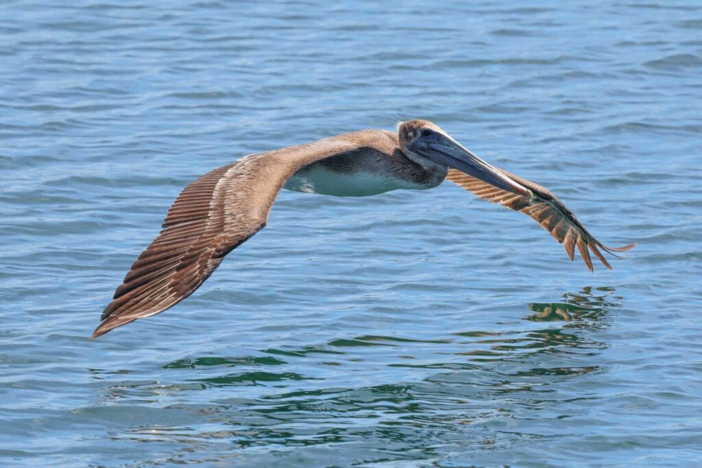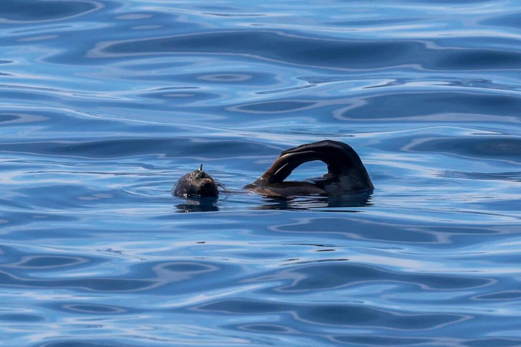 We left Mission bay and cruised out to the west and enjoyed the nice cool breeze, a huge relief from the warmer temperatures on land. We ventured out to the drop-off and were alerted there was a Fin whale sighting earlier in the day. We waited a good 15-min at its last known location then began our search to the north. We almost made it La Jolla, when we sighted some splashes up ahead! We observed a pod of ~50 Short-beaked Common dolphins! We were on track to the dolphins when a surprise rare sighting of a Guadalupe fur seal was “jug-handling” at the oceans surface! This a common behavior of this species that often tells us it’s a Guadalupe fur seal and not any other pinniped like a California sea lion, which we normally tend to encounter. You could see it’s cute little head resting and it’s longer ear flap sticking out, also another identification characteristic! Once we caught up with the Shorties we noticed a couple of cow/calf pairs, an exciting sight to see! The calves followed mom very closely even as they were escorted to surf in our wake! They were traveling to the SW while we continued more straight south. We waved goodbye and wished them well!