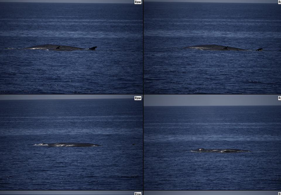We got a rare glimpse of a cow-calf fin whale pair this afternoon! We’re out here almost every single day, and we might see a cow/calf pair of fins only a few times a year—if we’re lucky. Today, we got to spend quality time with this cow and calf as they surfaced for long periods right next to each other. Then baby went on a little adventure—we’d see it pop up far away, then come back and swim circles around gargantuan mama’s head. We also got a brief look at a very sneaky minke whale.