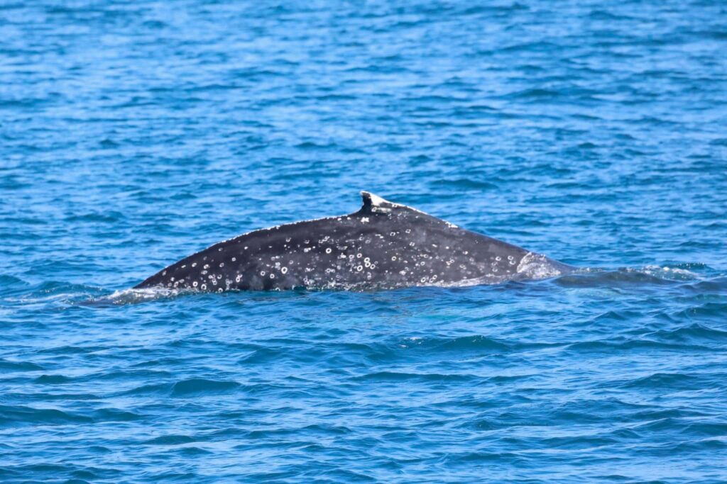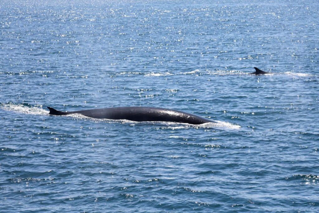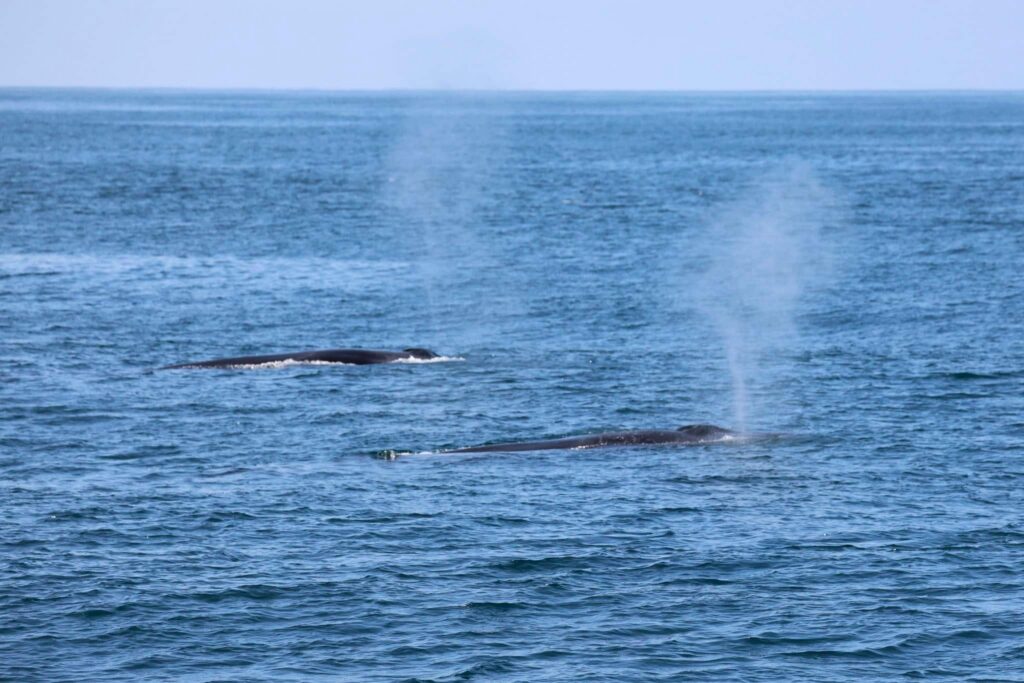 The spouts we saw were very tall and narrow followed by dark backs and the unmistakable pronounced fin of a fin whale! And we have 3 feeding on krill in the area!! 2 had synced up their breath cycles and were hanging out close together. We also got to see a younger humpback that joined the party. Making for a 2 species of baleen whale day!