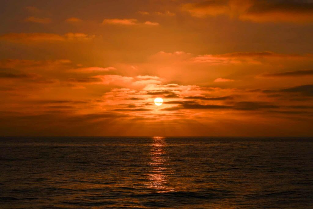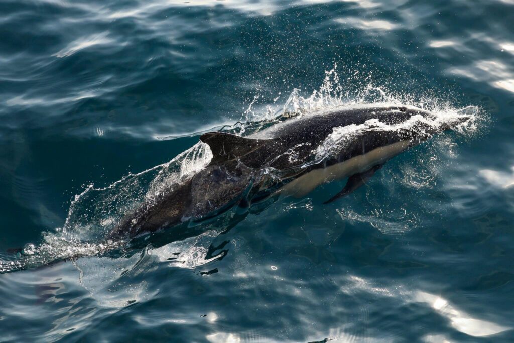 During our sunset trip, we cruised back out to the SW and only a couple miles from Mission bay, we sighted a feeding frenzy! There were birds diving into the water and underneath were some very active Long-beaked Common dolphins! They breached and porpoised to the north. We continued out to the SW and spotted some big dolphins splashes! While en route to the pod, a spout appeared before our eyes! We hung out with a Fin whale! Then another larger Fin whale surfaced to the east, closer to the coast! We were thrilled to have a Fin whale on each side of the boat! We turned to the Short-beaked Common dolphins for a quick look and turned in. On our way home, another fin whale surfaced in front of us. We had to wait it out, as we didn’t want to get too close too fast and potentially spook it! We sighted it and continued home! The sunset was amazing! We had one more quick sighting of ~30 Long-beaked Common dolphins!