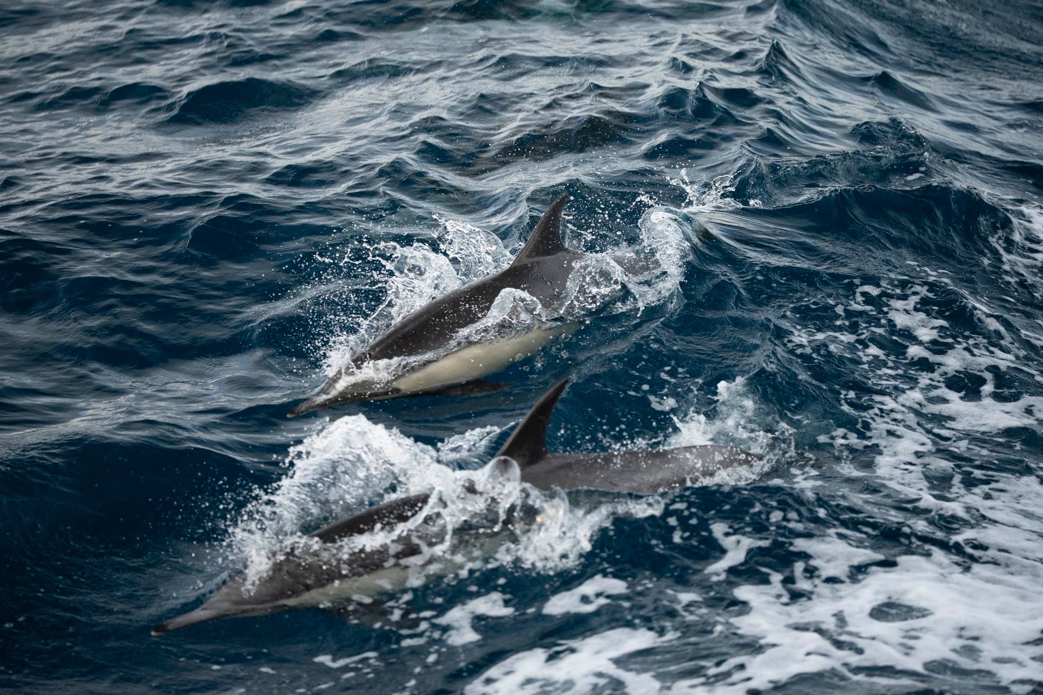 On our afternoon trip, we encountered a cow-and-calf pair, and the baby was so small it was still swimming a bit clumsily—lifting almost its entire head out of the water when it surfaced. We also had amazing pods of surfing long‑beaked common dolphins closer to shore. They were actively hunting fish, slapping them with their tails and catching them while they were still stunned.