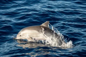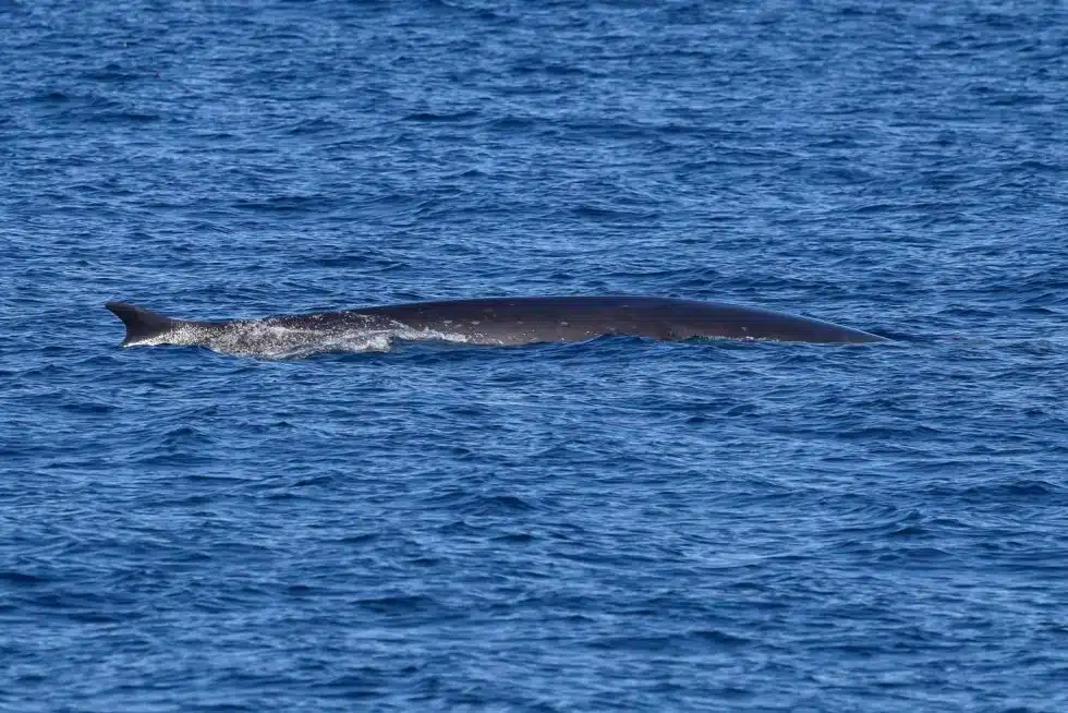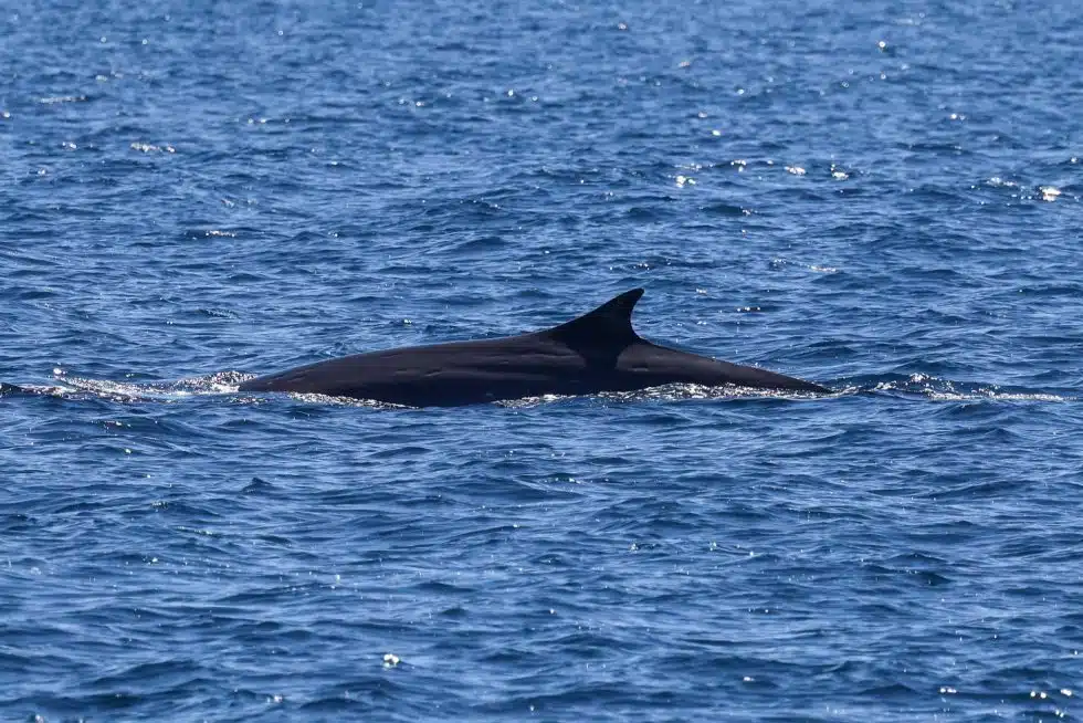 Right along the drop‑off, we found a lively pod of short‑beaked common dolphins foraging. This group was on fire — leaping, playing around the boat, and the babies were launching extra high and wiggling all over the place. The cutest kind of chaos.