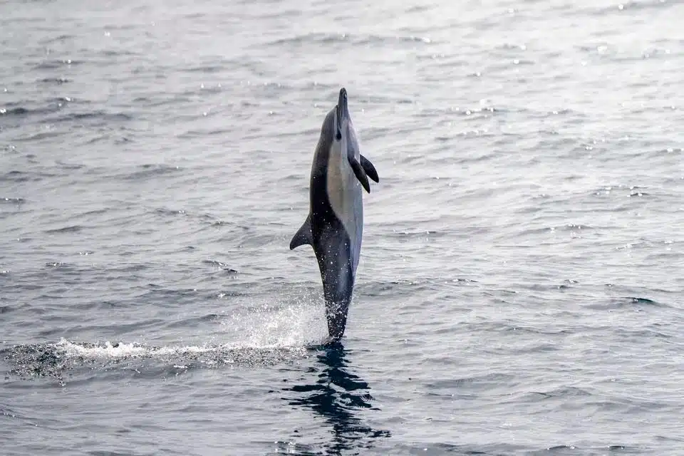 This afternoon was strictly a dolphin party. We had a pod of long‑beaked common dolphins pretty close to shore, and an awesome pod of short‑beaked commons a little farther out. These shorties were POPPIN’ OFF — like popcorn in a hot pan. Launching straight into the sky again and again, not just one at a time but 5–10 dolphins exploding out of the water together.